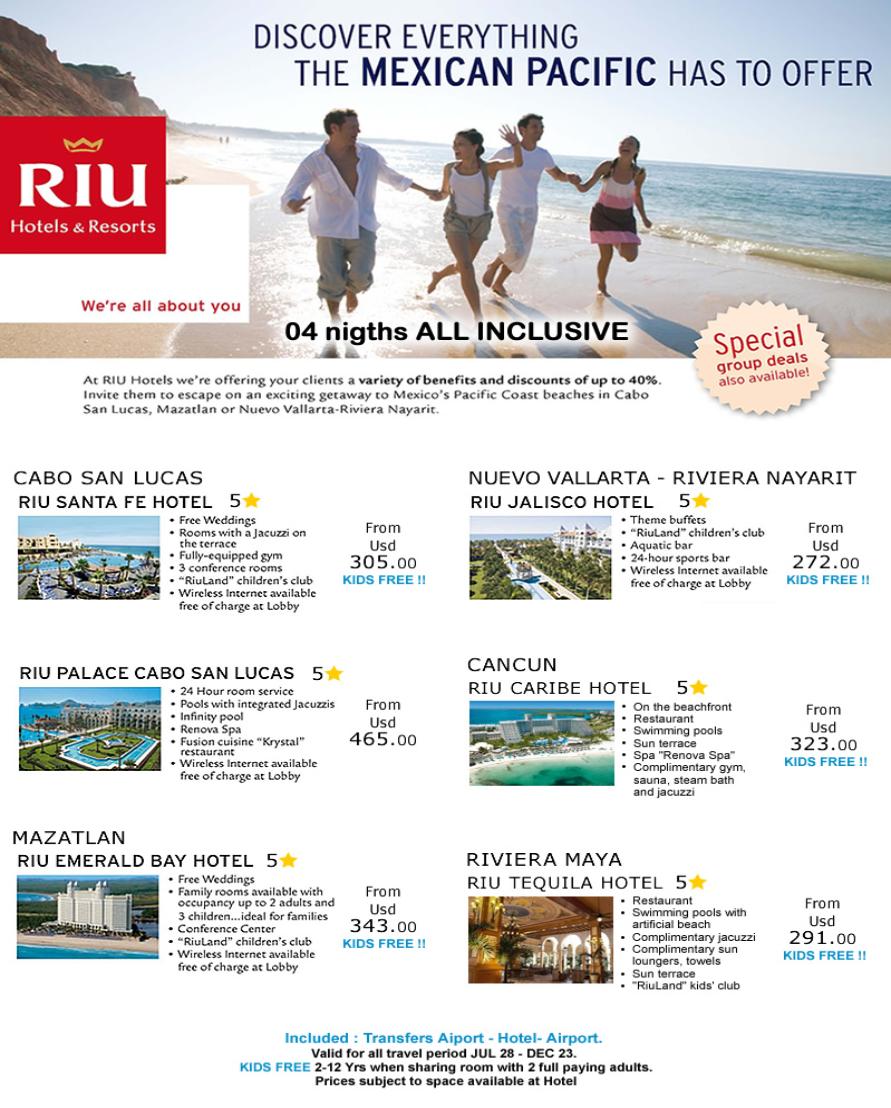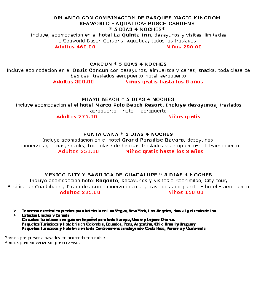 | CANCUN * 5 DIAS 4 NOCHES Incluye acomodacion en el Oasis Cancun con desayunos, almuerzos y cenas, snacks, toda clase de bebidas, y traslados aerupuerto-hotel-aeropuerto Adultos $300.00 Niños gratis hasta los 8 años |